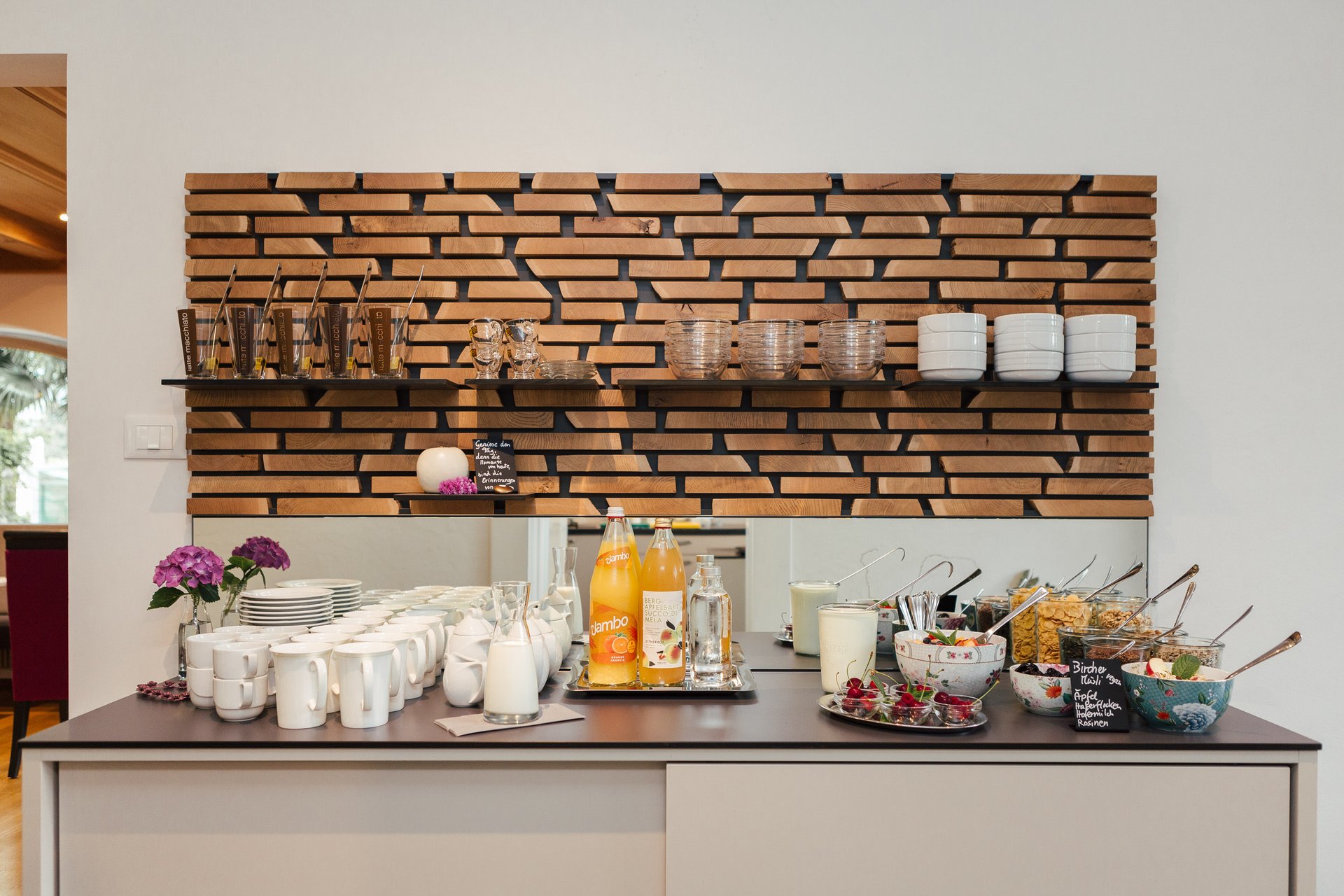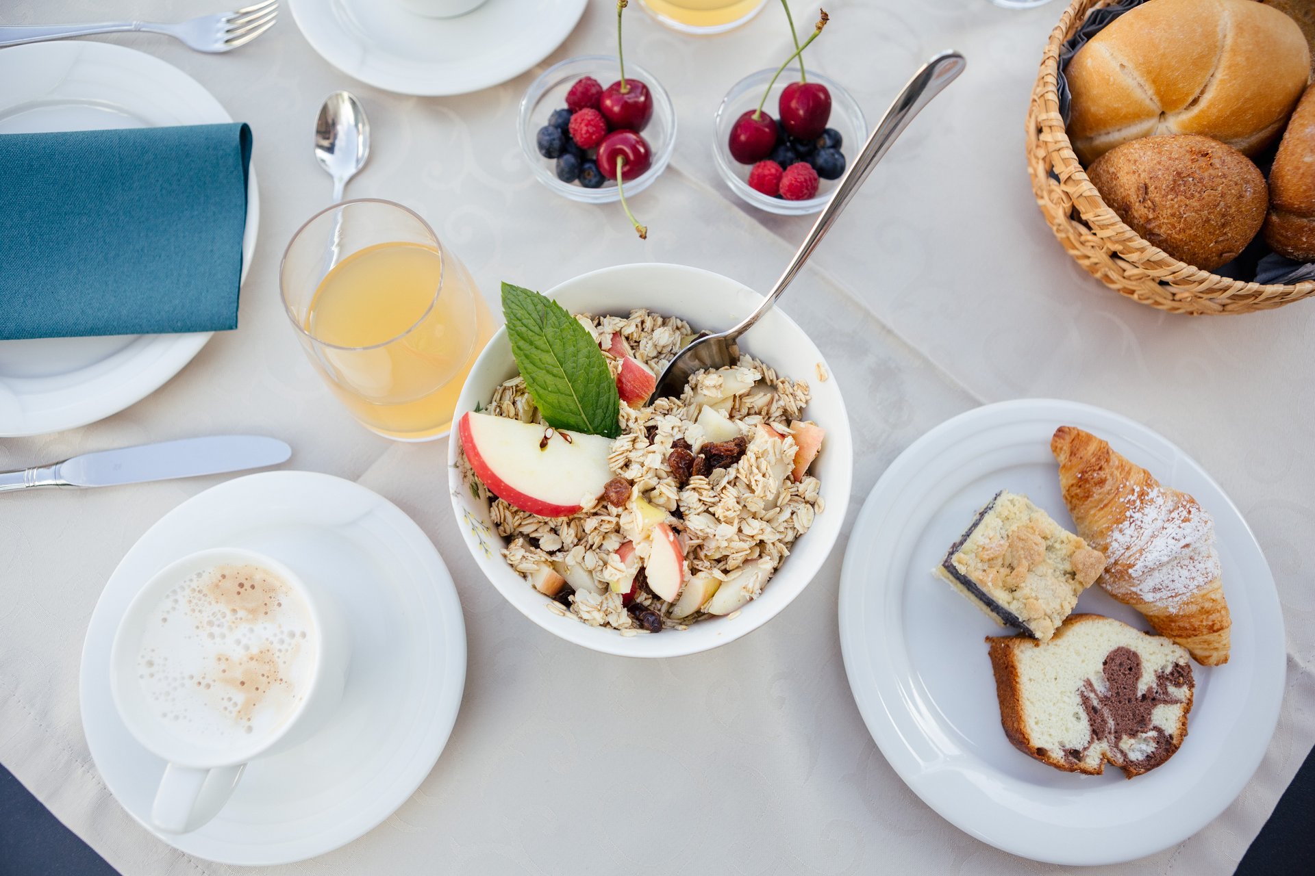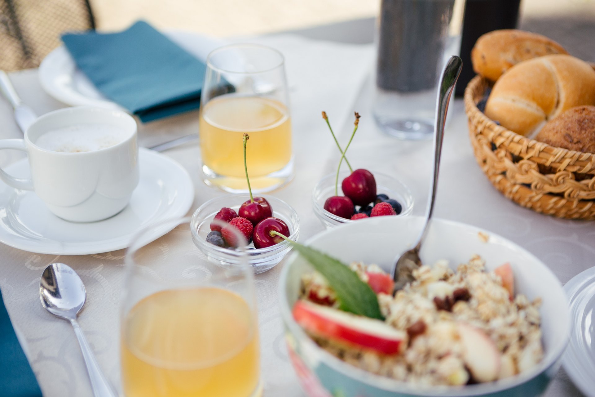 Knusprig, fruchtig, herzhaft, pikant, und süß, dazu duftender Kaffee- oder Teegenuss. Bei uns beginnen Sie den Tag mit einem guten Frühstück, von 7:30 Uhr bis 10:00 Uhr. Genießen Sie frische Brötchen von der Meraner Handwerksbäckerei und vielen Südtiroler Qualitätsprodukten. Außerdem verwöhnen wir Sie mit frischem Obstsalat, Müslis, süßen Brotaufstrichen, Säften, gekochten Eiern und süßem Gebäck. An warmen Tagen können Sie gerne auch im Freien frühstücken.