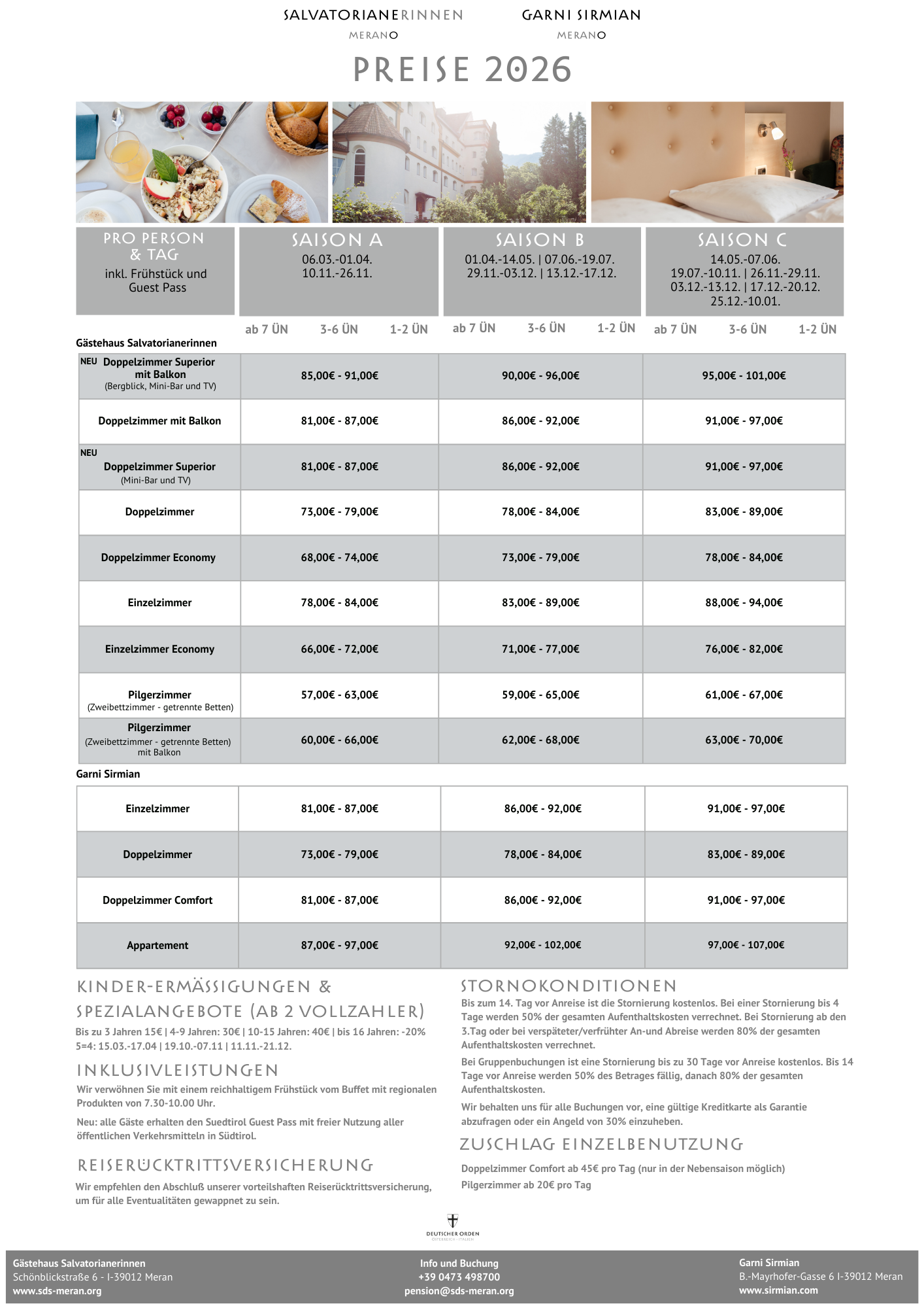 - Bei einer Stornierung ab dem dritten Tag vor Anreise oder im Falle einer verspäteten bzw. vorzeitigen An- oder Abreise behalten wir uns vor, 80% der Gesamtkosten des Aufenthalts zu berechnen.